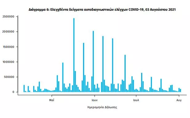 Αυτοδιαγνωστικοί έλεγχοι (Self-tests): Έως 02 Αυγούστου 2021, έχουν καταγραφεί ηλεκτρονικά 30.587.713 δηλώσεις αποτελέσματος αυτοδιαγνωστικού ελέγχου, ενώ 832.591 άτομα προσήλθαν για επανέλεγχο.
