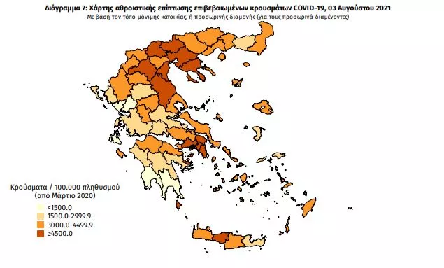 Γεωγραφική διασπορά: Ο χάρτης αποτυπώνει τη γεωγραφική κατανομή των συνολικών κρουσμάτων COVID-19 (από την αρχή της επιδημίας) ανά Περιφερειακή Ενότητα της χώρας, με βάση την δηλωθείσα διεύθυνση μόνιμης κατοικίας του ασθενούς, ή τη διεύθυνση προσωρινής διαμονής για τους τουρίστες και άλλους προσωρινά διαμένοντες στην Ελλάδα. Συμπεριλαμβάνονται τόσο κρούσματα με ιστορικό ταξιδίου (“εισαγόμενα”) όσο και κρούσματα με πιθανή εγχώρια μετάδοση.