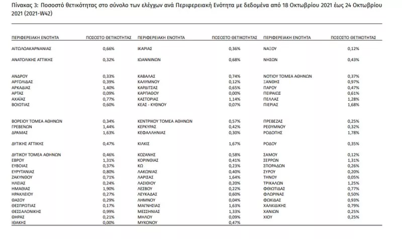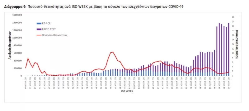 Την εβδομάδα αναφοράς (18 Οκτωβρίου 2021 - 24 Οκτωβρίου 2021), το ποσοστό θετικότητας ήταν 1.61% σε σύνολο 1.393.526 εργαστηριακών ελέγχων (RT-PCR/Rapid-Ag) και 0.36% σε σύνολο 1.831.691 αυτοδιαγνωστικών ελέγχων.