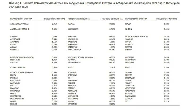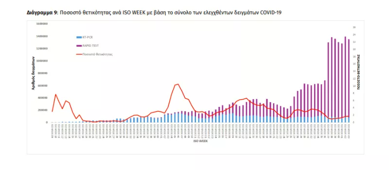 Την εβδομάδα αναφοράς, το ποσοστό θετικότητας ήταν 1.96% σε σύνολο 1.352.124 εργαστηριακών ελέγχων (RT-PCR/Rapid-Ag) και 0.43% σε