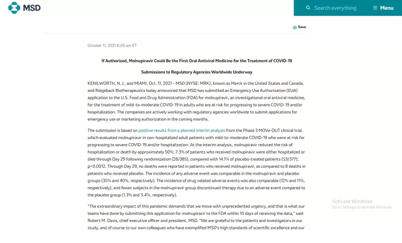 Στοιχεία που δημοσιεύθηκαν την περασμένη εβδομάδα ανέφεραν ότι το πειραματικό αντιικό φάρμακο Molnupiravir που αναπτύχθηκε από την εταιρεία Merck & Co μειώνει στο μισό τον κίνδυνο θανάτου ή νοσηλείας λόγω σοβαρής COVID-19.