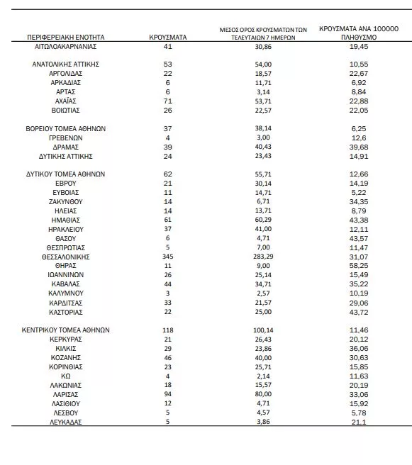 41 κρούσματα στην Π.Ε. Αιτωλοακαρνανίας
