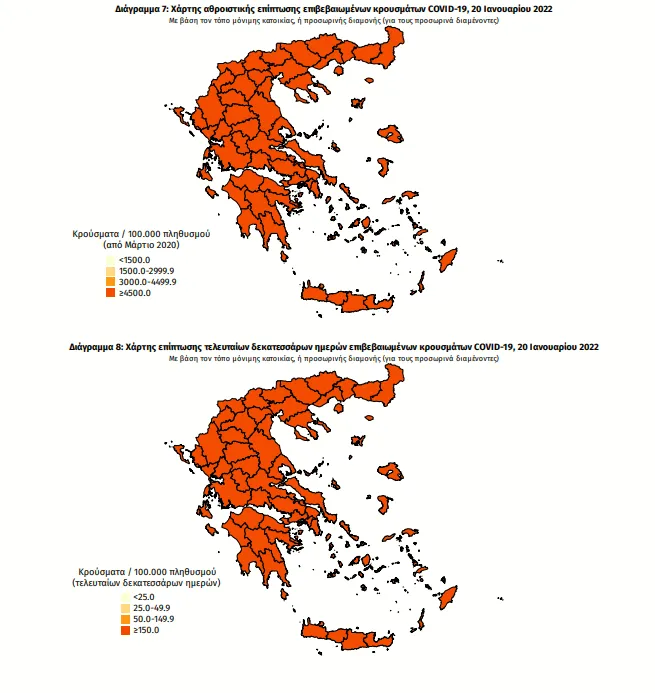 Στο «κόκκινο» παραμένει η Αττική καθώς από τα 18.869 νέα κρούσματα που ανακοίνωσε σήμερα ο ΕΟΔΥ οι 7.139 μολύνσεις εντοπίζονται στο Λεκανοπέδιο.