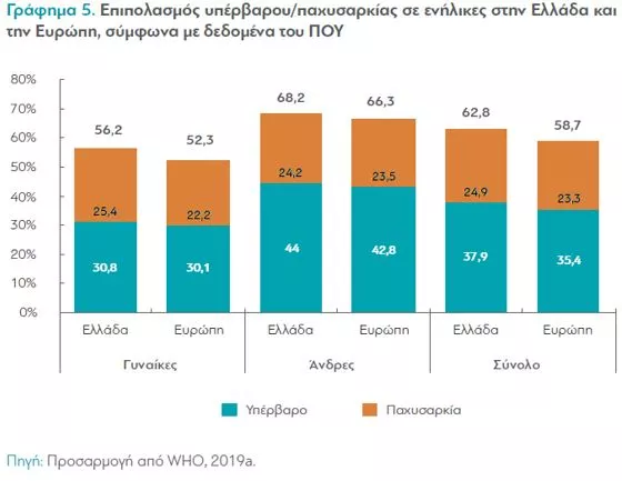 Όπως είπαμε και στην αρχή, περισσότεροι από τους μισούς ενήλικες στην Ελλάδα είναι παχύσαρκοι ή υπέρβαροι. Σύμφωνα με δεδομένα του ΠΟΥ από το 2019, το 37,9% των Ελλήνων ενηλίκων είναι υπέρβαροι και το 24,9% είναι παχύσαρκοι. Το 44% των Ελλήνων και το 30,8% των Ελληνίδων είναι υπέρβαροι/ες, ενώ τα δύο φύλα εμφανίζουν τα ίδια ποσοστά παχυσαρκίας: ένας στους τέσσερις Έλληνες και μία στις τέσσερις Ελληνίδες ανήκουν σε αυτή την κατηγορία.