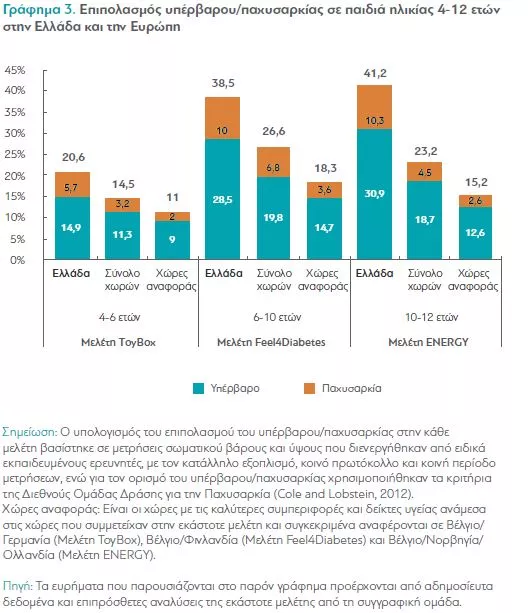 Παράλληλα, τα παιδιά στην Ελλάδα εμφανίζουν τα μεγαλύτερα ποσοστά παχυσαρκίας στην Ευρώπη. Το ποσοστό των παιδιών ηλικίας 4-6 ετών που είναι παχύσαρκα ή υπέρβαρα είναι 20,6%. Στα παιδιά ηλικίας 6-10 ανεβαίνει στο 38,5% και στα παιδιά ηλικίας 10-12 ετών φτάνει το 41,2%.