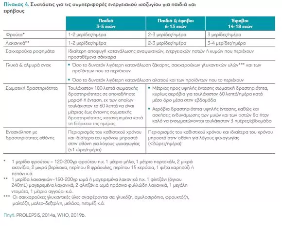 Τι γίνεται, όμως, με τα παιδιά; Στον παρακάτω πίνακα εμφανίζονται οι συστάσεις για τη διατροφή και τη δραστηριότητα παιδιών διαφόρων ηλικιών.