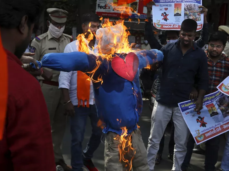 Στην Ινδία, ακραίοι Ινδουιστές εθνικιστές διαμαρτυρήθηκαν για τον εορτασμό της ημέρας του Αγίου Βαλεντίνου και απείλησαν όσους τη γιορτάζουν.