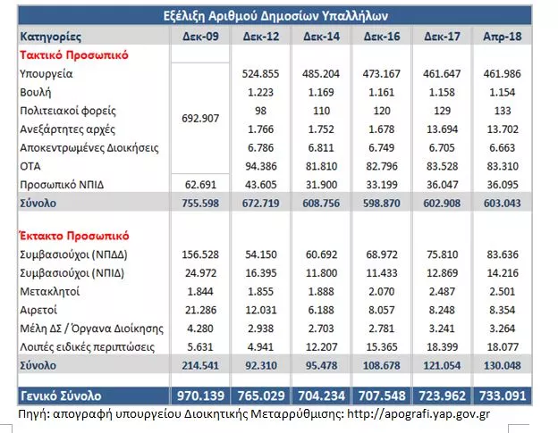 Ο παρακάτω πίνακας εμφανίζει με βάση τα επίσημα στοιχεία του υπουργείου την εξέλιξη του αριθμού των δημοσίων υπαλλήλων ανά κατηγορία από το Δεκέμβρη 2009 μέχρι τον Απρίλη 2018.