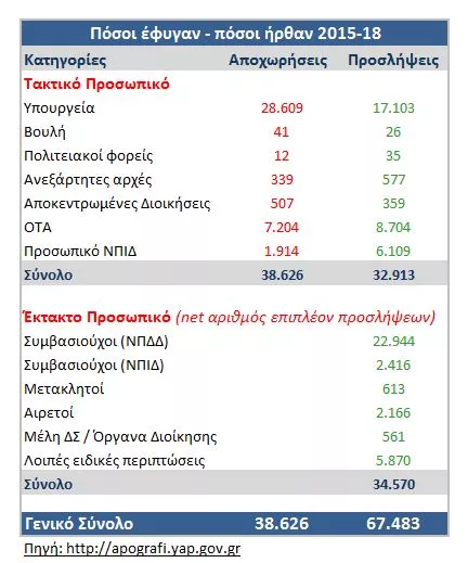 Ο παρακάτω πίνακας αποκαλύπτει τον αριθμό αποχωρήσεων – προσλήψεων την 3ετία 2015-18. Για το έκτακτο προσωπικό δεν έχουμε στοιχεία αποχωρήσεων και γι αυτό λογίζουμε ως πρόσληψη την καθαρή αύξηση του αριθμού των έκτακτων υπαλλήλων. Στην πραγματικότητα λοιπόν, ο πραγματικός αριθμός των προσλήψεων είναι ακόμα μεγαλύτερος από 67,5 χιλιάδες.