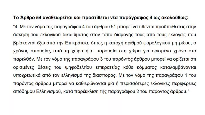 «Το Άρθρο 54 αναθεωρείται και προστίθεται νέα παράγραφος 4 ως ακολούθως: “4. Με τον νόμο της παραγράφου 4 του άρθρου 51 μπορεί να τίθενται προϋποθέσεις στην άσκηση του εκλογικού δικαιώματος στον τόπο διαμονής τους από τους εκλογείς που βρίσκονται έξω από την Επικράτεια, όπως η κατοχή αριθμού φορολογικού μητρώου, ο χρόνος απουσίας από τη χώρα ή η παρουσία στη χώρα για ορισμένο χρόνο στο παρελθόν. Με τον νόμο της παραγράφου 3 του παρόντος άρθρου μπορεί να ορίζεται ότι ορισμένες θέσεις του ψηφοδελτίου επικρατείας κάθε κόμματος καταλαμβάνονται υποχρεωτικά από τον ελληνισμό της διασποράς. Με τον νόμο της παραγράφου 1 του παρόντος άρθρου μπορεί να καθιερώνονται μία ή περισσότερες εκλογικές περιφέρειες απόδημου Ελληνισμού, κατά παρέκκλιση της παραγράφου 2 του παρόντος άρθρου».