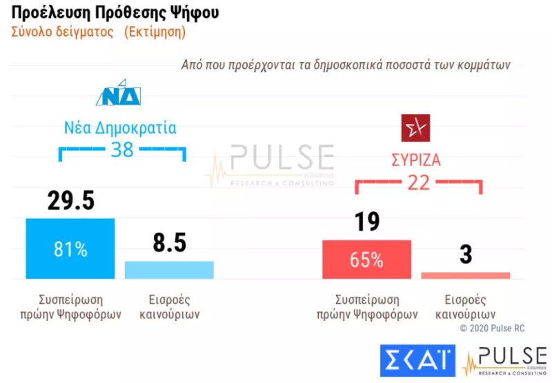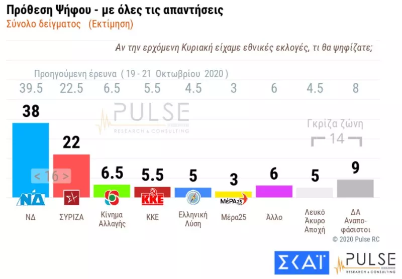 Διαφορά 17 ποσοστιαίων μονάδων στην πρόθεση ψήφου (με αναγωγή επί των εγκύρων) καταγράφει τον Νοέμβριο η Νέα Δημοκρατία έναντι του ΣΥΡΙΖΑ σύμφωνα με τα ευρήματα της δημοσκόπησης της PULSE για λογαριασμό του ΣΚΑΪ που παρουσιάστηκαν στο κεντρικό δελτίο του σταθμού με τη Σία Κοσιώνη.