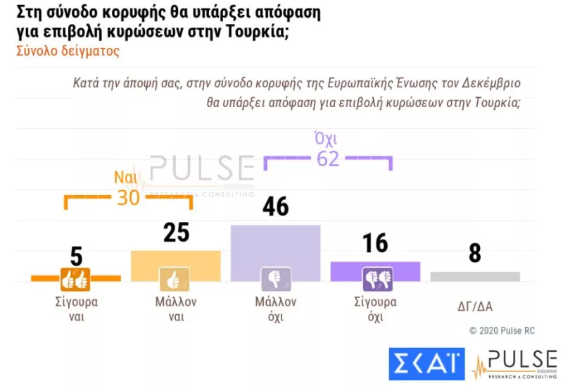 Συγκεκριμένα, μόλις το 5 % των ερωτηθέντων θεωρεί σίγουρο ότι θα επιβληθούν κυρώσεις στην Τουρκία, ενω το25% απαντά μάλλον ναι, αντίθετα, το 46% των ερωτηθέντων απαντα μάλλον όχι και το 16% δηλώνουν σίγουροι ότι δεν θα υπάρχουν κυρώσεις για την Άγκυρα.