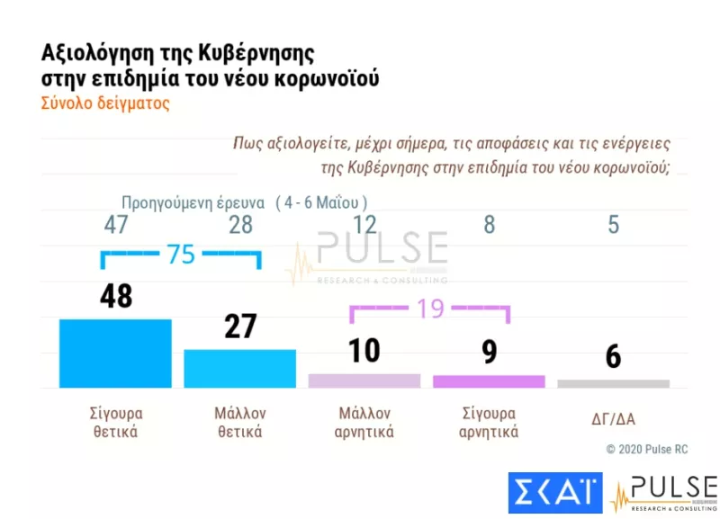 Στην ερώτηση για το πώς αξιολογούν τη κυβέρνηση στην πανδημία του νέου κορωνοϊού το 75% των ερωτηθέντων συνολικά απαντά θετικά (σίγουρα θετικά 48% - μάλλον θετικά 27%) έναντι 47% και 28% αντίστοιχα στην προηγούμενη δημοσκόπηση (4 – 6 Μαΐου). Το 19% των ερωτηθέντων συνολικά απαντά αρνητικά (μάλλον αρνητικά 10% - σίγουρα αρνητικά 9%) έναντι 8% και 5% αντίστοιχα στην προηγούμενη έρευνα. Το 6% δηλώνει δεν ξέρω/δεν απαντώ, έναντι 5% στην προηγούμενη έρευνα.