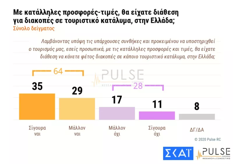 Στην ερώτηση αν προτίθενται να κάνουν διακοπές σε τουριστικό κατάλυμα στην Ελλάδα με τις κατάλληλες προσφορές – τιμές των 64% συνολικά των πολιτών απαντά σίγουρα ναι (35%) ή μάλλον ναι (29%), ενώ το 28% συνολικά μάλλον όχι (17%) ή σίγουρα όχι (11%). 8% δηλώνει δεν ξέρω/δεν απαντώ.