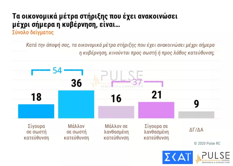 Σε ό,τι αφορά τα οικονομικά μέτρα της κυβέρνησης το 54% συνολικά δηλώνει ότι είναι σίγουρα σε σωστή κατεύθυνση (18%) ή μάλλον σε σωστή κατεύθυνση (36%). Το 37% των ερωτώμενων συνολικά απαντά ότι είναι μάλλον σε λανθασμένη κατεύθυνση (16%) ή σίγουρα σε λανθασμένη κατεύθυνση (21%). Το 9% των ερωτώμενων δηλώνει δεν ξέρω/δεν απαντώ.