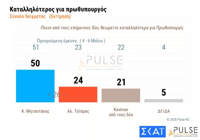 Όσον αφορά το ποιος εκ των κ. Μητσοτάκη και Τσίπρα είναι καταλληλότερος για πρωθυπουργός το 50% των ερωτώμενων απαντά ο Κυριάκος Μητσοτάκης (έναντι 51% στην προηγούμενη έρευνα), ενώ το 24% ο Αλέξης Τσίπρας (23%). 21% απαντά κανένας από τους δύο (22%). 5% δηλώνει δεν ξέρω/δεν απαντώ.
