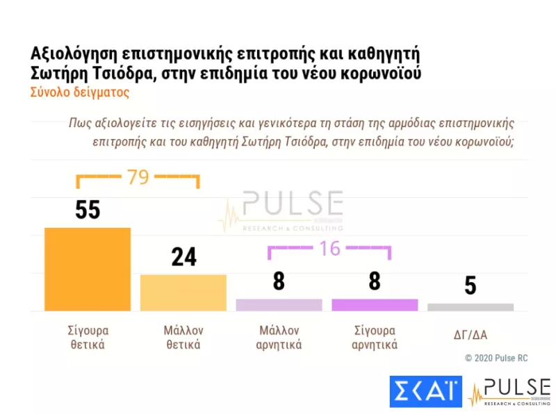 Όσον αφορά την αξιολόγηση της επιστημονικής επιτροπής, και του Σωτήρη Τσιόδρα προσωπικά, στην αντιμετώπιση της πανδημίας το 79% των ερωτώμενων συνολικά απαντά θετικά (55% σίγουρα θετικά – 24% μάλλον θετικά), έναντι 16% συνολικά που απαντά αρνητικά (8% μάλλον αρνητικά – 8% μάλλον θετικά). 5% των ερωτηθέντων δηλώνει δεν ξέρω/δεν απαντώ.
