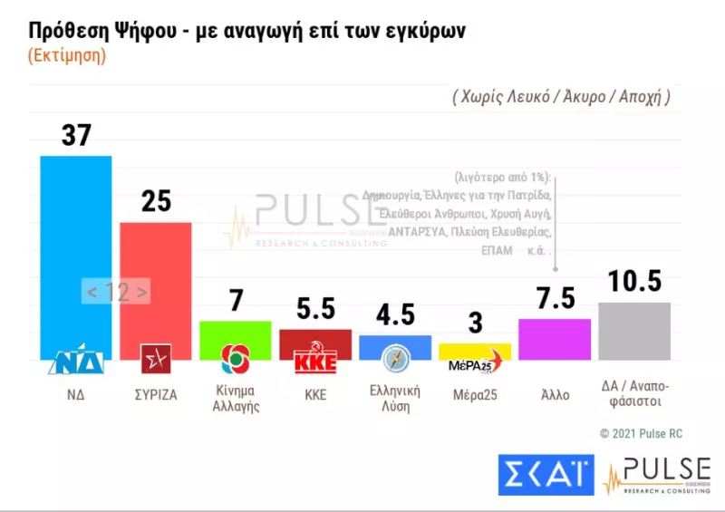 Προβάδισμα 12 μονάδων διατηρεί η Νέα Δημοκρατία έναντι του ΣΥΡΙΖΑ στην πρόθεση ψήφου με αναγωγή επί των εγκύρων, σύμφωνα με τη νέα μεγάλη δημοσκόπηση του ΣΚΑΪ και της Pulse που παρουσιάστηκε στο κεντρικό δελτίο ειδήσεων με τη Σία Κοσιώνη. Πιο αναλυτικά, η ΝΔ συγκεντρώνει 37%, ο ΣΥΡΙΖΑ 25%, ενώ ακολουθούν Κίνημα Αλλαγής με 7%, ΚΚΕ με 5,5%, Ελληνική Λύση με 4,5%, ΜέΡΑ25 με 3%. «Άλλο» απάντησε το 7,5% ενώ οι Αναποφάσιστοι/ΔΑ φτάνουν στο 10,5%.