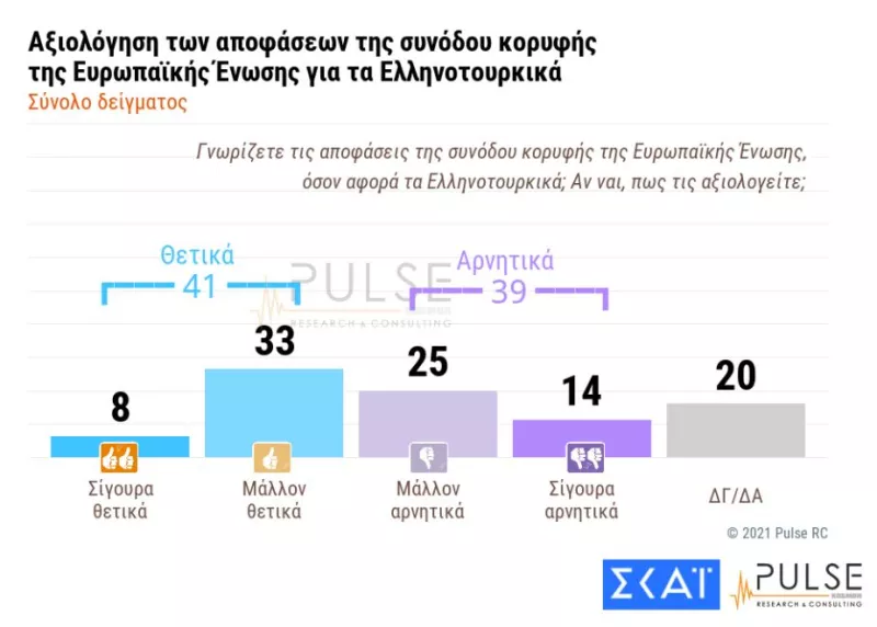 Σχετικά με τις αποφάσεις της Συνόδου Κορυφής της ΕΕ για τα ελληνοτουρκικά το 41% κρίνει ότι ήταν θετικές (33% μάλλον θετικά, 8% σίγουρα θετικά), ενώ το 39% εκτιμά ότι ήταν αρνητικές (25% μάλλον αρνητικά, 14% σίγουρα αρνητικά). Οι θετικές απαντήσεις για τις ευρωπαϊκές αποφάσεις προέρχονται κυρίως από ψηφοφόρους του Κινήματος Αλλαγής (66%) και της ΝΔ (55%) ενώ οι αρνητικές κυρίως από ψηφοφόρους του ΚΚΕ (67%) και του ΣΥΡΙΖΑ (47%).