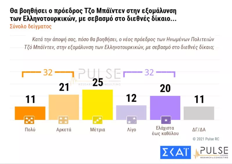 Στο ερώτημα εάν ο Αμερικανός πρόεδρος Τζο Μπάιντεν θα βοηθήσει στην εξομάλυνση των ελληνοτουρκικών με σεβασμό στο Διεθνές Δίκαιο, το 32% απάντησαν θετικά (πολύ 11%, αρκετά 21%) και το 32% αρνητικά (12% λίγο, 20% ελάχιστα έως καθόλου). Οι περισσότερες θετικές απαντήσεις δόθηκαν από ψηφοφόρους της ΝΔ (51%) και του Κινήματος Αλλαγής (42%) και οι περισσότερες αρνητικές από ψηφοφόρους του ΚΚΕ (72%) και του ΣΥΡΙΖΑ (39%).