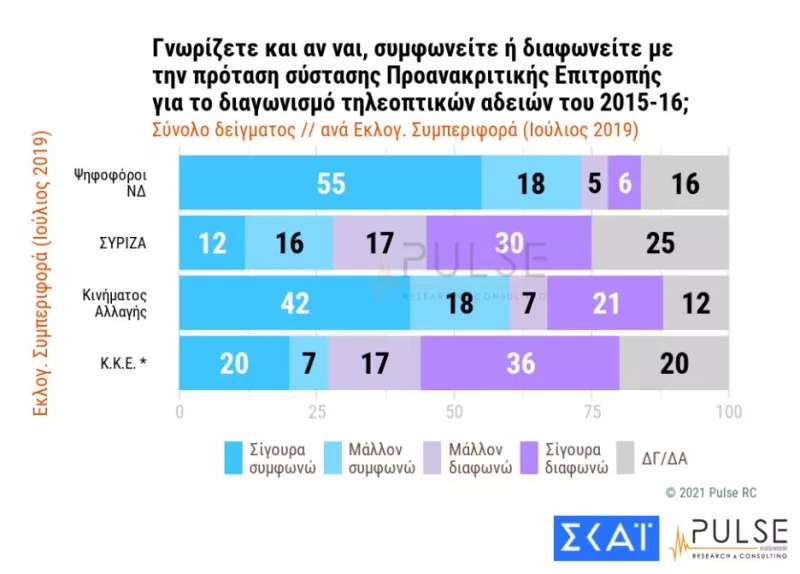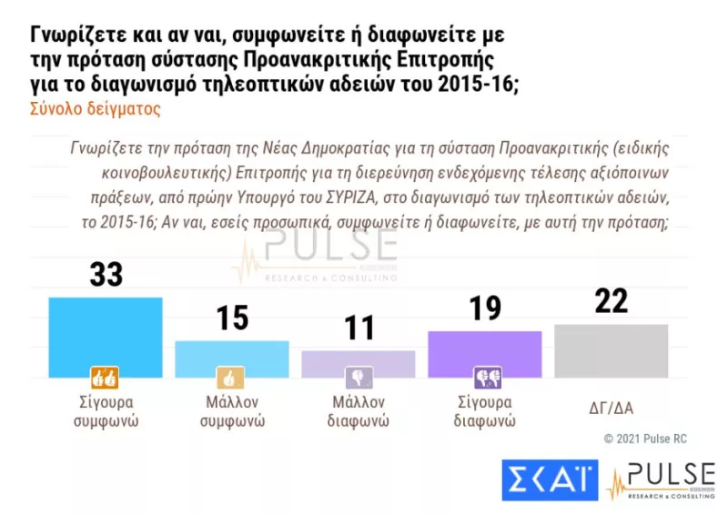 Με την πρόταση της ΝΔ για σύσταση προανακριτικής επιτροπής για τον διαγωνισμό των τηλεοπτικών αδειών, συμφωνεί το 33% των ερωτηθέντων, μάλλον συμφωνεί το 15%, μάλλον διαφωνεί το 11% και σίγουρα διαφωνεί το 19%.