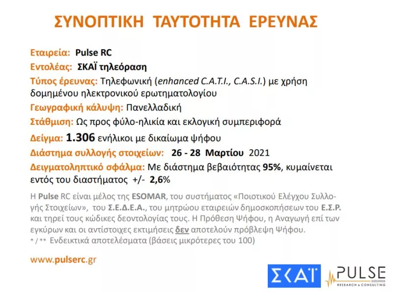 Η έρευνα της Pulse είναι πανελλαδική και έγινε τηλεφωνικά με τη χρήση δομημένου ηλεκτρονικού ερωτηματολογίου σε δείγμα 1.306 ατόμων το διάστημα 26 - 28 Μαρτίου 2021.