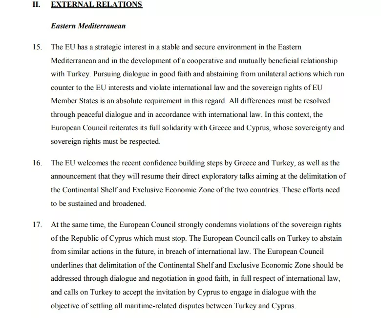 17. Ταυτόχρονα, το Ευρωπαϊκό Συμβούλιο καταδικάζει έντονα τις παραβιάσεις των κυριαρχικών δικαιωμάτων της Κυπριακής Δημοκρατίας που πρέπει να σταματήσουν. Το Ευρωπαϊκό Συμβούλιο καλεί την Τουρκία να απέχει από παρόμοιες ενέργειες στο μέλλον, κατά παράβαση του διεθνούς δικαίου. Το Ευρωπαϊκό Συμβούλιο υπογραμμίζει ότι η οριοθέτηση της υφαλοκρηπίδας και της αποκλειστικής οικονομικής ζώνης πρέπει να αντιμετωπιστεί μέσω διαλόγου και διαπραγματεύσεων με καλή πίστη, με πλήρη σεβασμό του διεθνούς δικαίου, και καλεί την Τουρκία να αποδεχτεί την πρόσκληση της Κύπρου για έναρξη διαλόγου με στόχο επίλυση όλων των θαλάσσιων διαφορών μεταξύ Τουρκίας και Κύπρου.