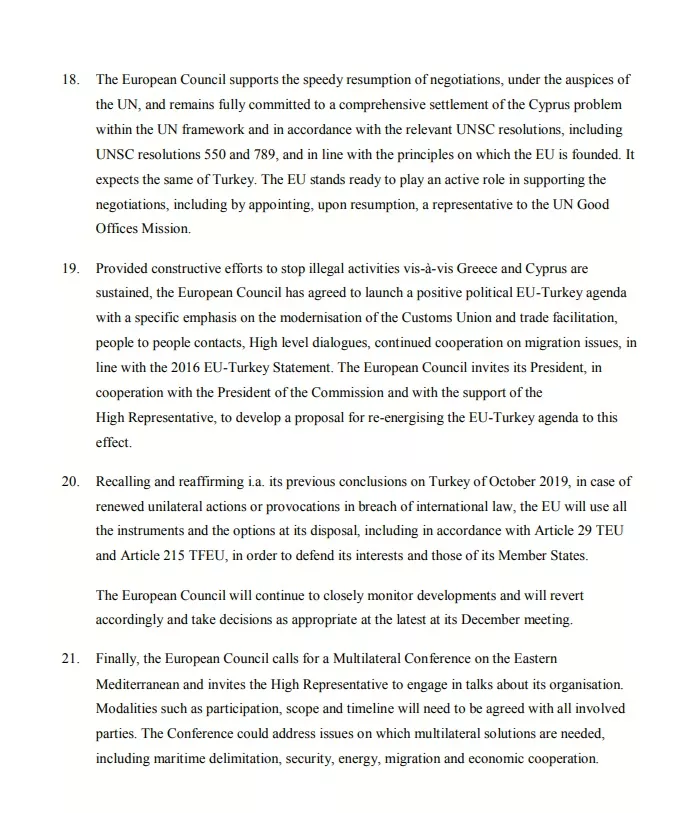18. Το Ευρωπαϊκό Συμβούλιο υποστηρίζει την ταχεία επανέναρξη των διαπραγματεύσεων, υπό την αιγίδα του ΟΗΕ, και παραμένει απολύτως δεσμευμένο για μια συνολική διευθέτηση του Κυπριακού στο πλαίσιο του ΟΗΕ και σύμφωνα με τα σχετικά ψηφίσματα του ΣΑ του ΟΗΕ, συμπεριλαμβανομένων των ψηφισμάτων 550 και 789 του ΣΑ του ΟΗΕ, και σύμφωνα με τις αρχές στις οποίες βασίζεται η ΕΕ. Περιμένει το ίδιο με την Τουρκία. Η ΕΕ είναι έτοιμη να διαδραματίσει ενεργό ρόλο στη στήριξη των διαπραγματεύσεων, μεταξύ άλλων διορίζοντας, μετά την επανέναρξη, έναν εκπρόσωπο στην αποστολή του ΟΗΕ.