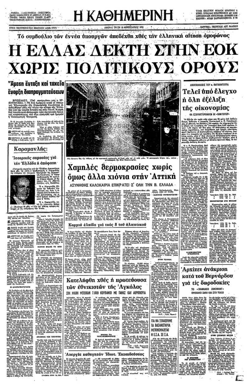 Σε ό,τι αφορά τις ελληνικές εφημερίδες, η «Καθημερινή» σημείωνε: «...η ένταξη της χώρας μας στην Ευρωπαϊκή Κοινότητα, αποτελεί από χθες εθνική πραγματικότητα και είναι κτήμα ολόκληρου του έθνους, πέρα από κόμματα, παρατάξεις, τοποθετήσεις και απόψεις που αναπτύχθηκαν έως τώρα». Η ιστορική εφημερίδα έγραφε, όμως, και αυτό: «Τώρα, θα ήταν λάθος να νομιστεί ότι η ένταξή μας στην Ευρωπαϊκή Κοινότητα αποτελεί ένα είδος ‘πανάκειας' που θεραπεύει αμέσως και αυτόματα όλα τα δεινά μας. Η ένταξη δεν είναι φτάσιμο αλλά αφετηρία για ένα καλύτερο και ασφαλέστερο μέλλον».