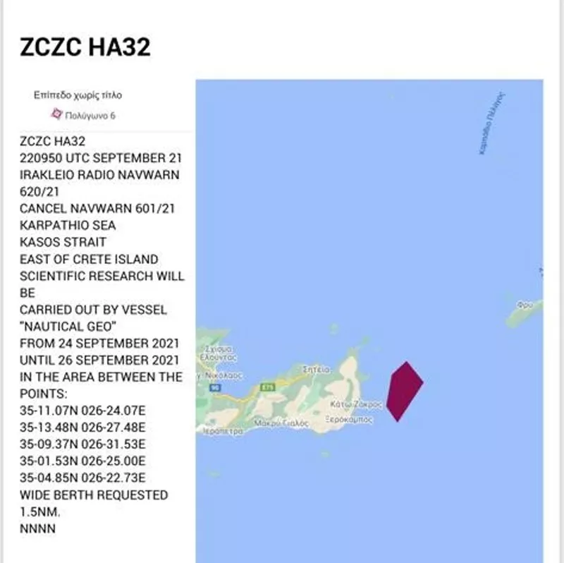 Παράλληλα, χτες, τουρκικό πολεμικό πλοίο παρενόχλησε σκάφος που διεξήγαγε επιστημονικές έρευνες εντός της οριοθετημένης ελληνικής υφαλοκρηπίδας.