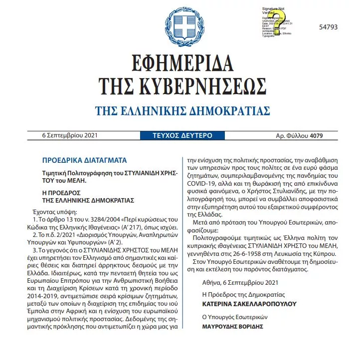 Τέλος, αναφέρεται: «Μετά από πρόταση του υπουργού Εσωτερικών, αποφασίζουμε: Πολιτογραφούμε τιμητικώς ως Έλληνα πολίτη τον κυπριακής ιθαγένειας Στυλιανίδη Χρήστο του Μελη, γεννηθέντα στις 26-6-1958 στη Λευκωσία της Κύπρου».