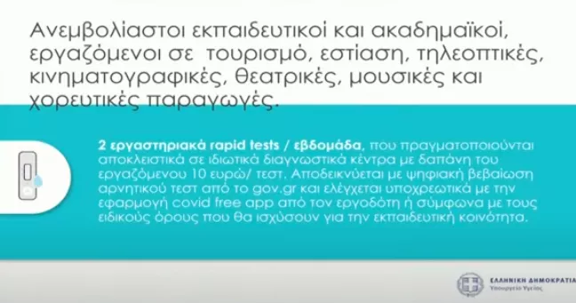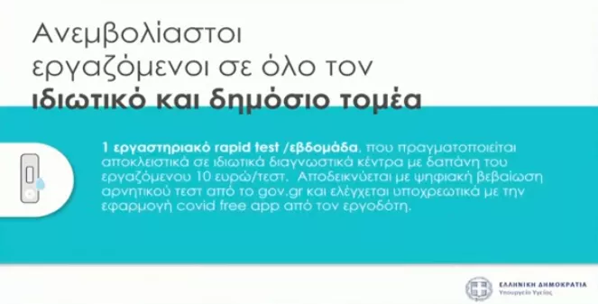 -Οι ανεμβολίαστοι εργαζόμενοι σε ιδιωτικό και δημόσιο τομέα θα κάνουν ένα εργαστηριακό rapid test την εβδομάδα με κόστος 10 ευρώ