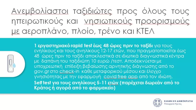 -Οι ανεμβολίαστοι ταξιδιώτες άνω των 12 ετών θα κάνουν ένα εργαστηριακό rapid τεστ 48 ώρες πριν το ταξίδι, ενώ οι άνω των πέντε ετών θα κάνουν self test.