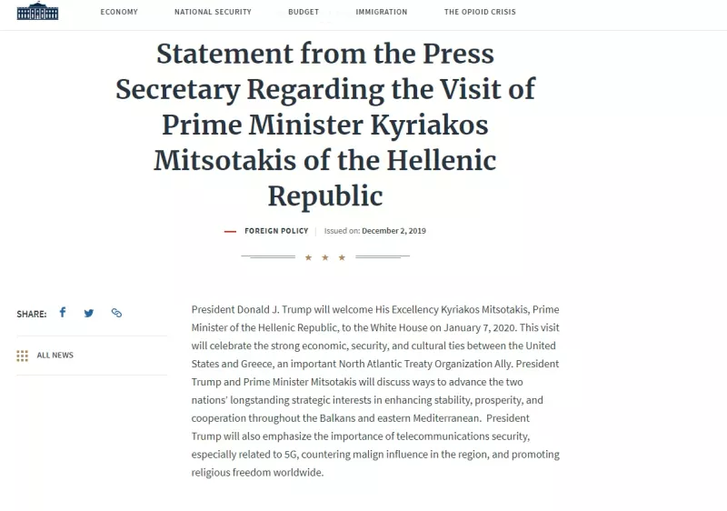 Όπως επισημαίνει η ανακοίνωση της Αμερικανικής Προεδρίας, η επίσκεψη του Κυριάκου Μητσοτάκη θα πραγματοποιηθεί στις 7 Ιανουαρίου και «θα γιορτάσει τους ισχυρούς δεσμούς στην οικονομία, τον πολιτισμό και την ασφάλεια μεταξύ των Ηνωμένων Πολιτειών και της Ελλάδας, ενός σημαντικού συμμάχου στο ΝΑΤΟ».