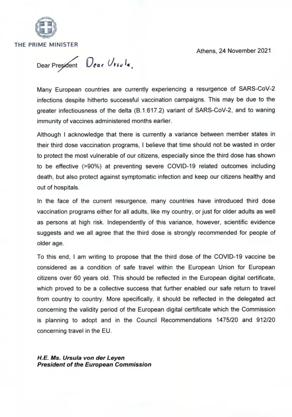 Την πραγματοποίηση της 3ης δόσης του εμβολίου ως προϋπόθεση ισχύος για τους άνω των 60 ετών του ευρωπαϊκού ψηφιακού πιστοποιητικού εμβολιασμού (EU DCC) για ταξίδια εντός της ΕΕ προτείνει ο Κυριάκος Μητσοτάκης σε επιστολή του προς την πρόεδρο της Ευρωπαϊκής Επιτροπής Ούρσουλα φον ντερ Λάιεν.