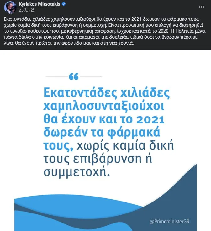 Τη διαβεβαίωση ότι «εκατοντάδες χιλιάδες χαμηλοσυνταξιούχοι θα έχουν και το 2021 δωρεάν τα φάρμακά τους, χωρίς καμία δική τους επιβάρυνση ή συμμετοχή» έδωσε ο πρωθυπουργός Κυριάκος Μητσοτάκης με ανάρτησή του στο Facebook. Ο πρωθυπουργός τόνισε ότι είναι προσωπική του επιλογή να διατηρηθεί το ευνοϊκό καθεστώς που με κυβερνητική απόφαση ίσχυσε και κατά το 2020.