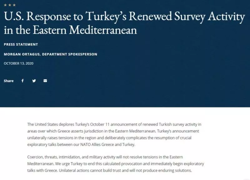 Έντονη είναι η αντίδραση των Ηνωμένων Πολιτειών στις νέες τουρκικές προκλήσεις στην Ανατολική Μεσόγειο, με τις παράνομες Navtex και τις έρευνες του σεισμογραφικού Ορούτς Ρέις σε ελληνική υφαλοκρηπίδα.