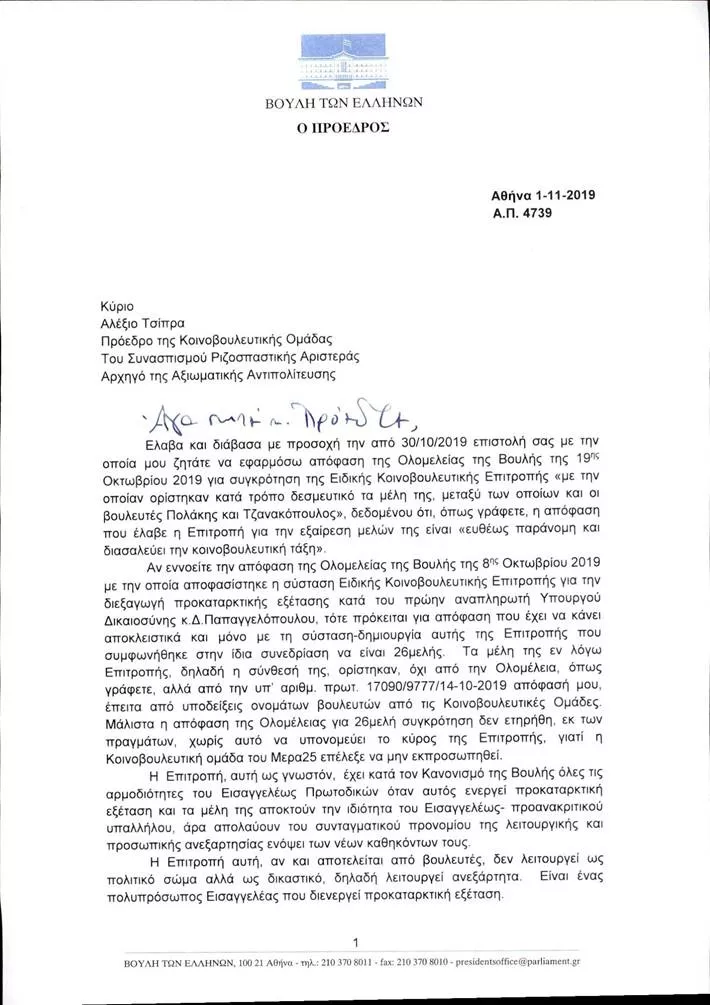 Την ουσία του σκεπτικού του Αλέξη Τσίπρα περί παράνομης απόφασης εξαίρεσης των κ.κ. Πολάκη και Τζανακόπουλου από την Προανακριτική Επιτροπή και παραβίασης της κοινοβουλευτικής τάξης, απορρίπτει ο Πρόεδρος της Βουλής, αναγνωρίζοντας τη δικαιοδοσία της Επιτροπής να αποφαίνεται επί τέτοιων ζητημάτων και καθιστώντας κομψά τον Πρόεδρο του ΣΥΡΙΖΑ συνυπεύθυνο για την τήρηση της νομιμότητας και της ευταξίας.