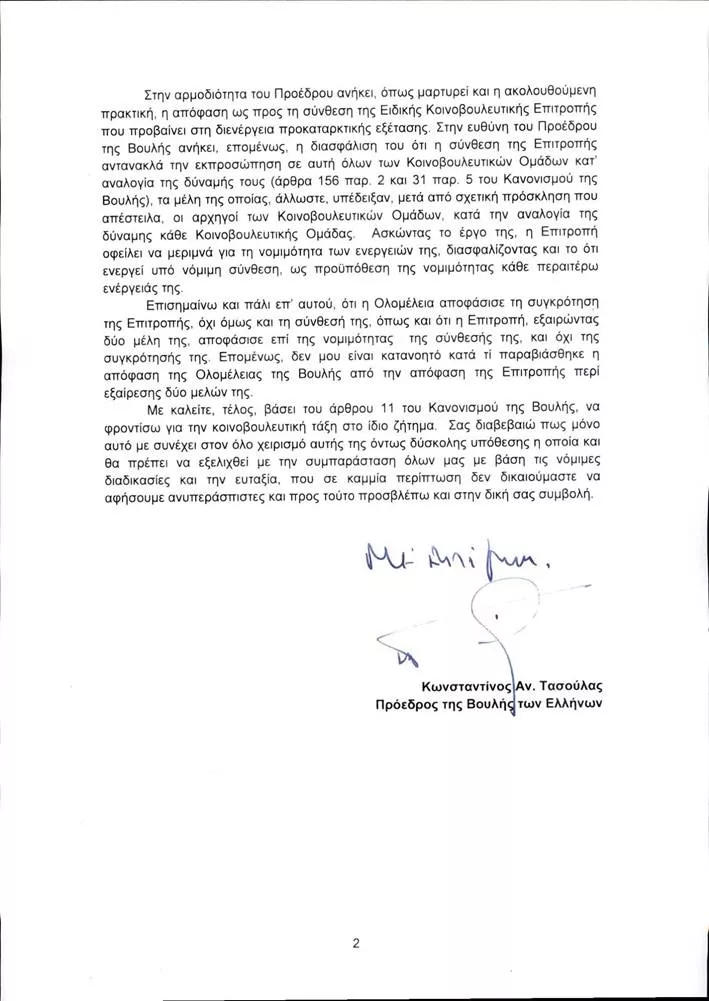 «Επισημαίνω ότι η Ολομέλεια αποφάσισε τη συγκρότηση της Επιτροπής, όχι όμως και τη σύνθεσή της, όπως και ότι η Επιτροπή, εξαιρώντας δύο μέλη της αποφάσισε επί της νομιμότητας της σύνθεσής της, και ότι της συγκρότησής της. Επομένως, δεν μου είναι κατανοητό κατά τί παραβιάσθηκε η απόφαση της Ολομέλειας της Βουλής από την απόφαση της Επιτροπής περί εξαίρεσης δύο μελών της», αναφέρει χαρακτηριστικά στην επιστολή του.