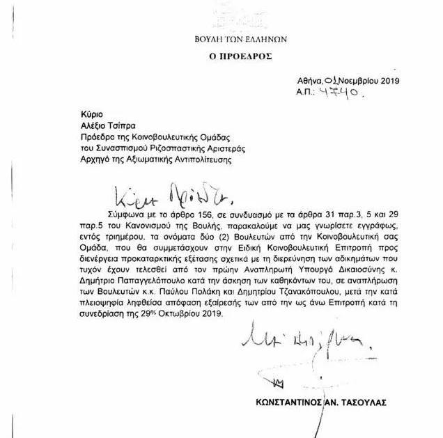 Απαντώντας, δε, εμμέσως στις απειλές του Παύλου Πολάκη ότι ο ίδιος και ο κ. Τζανακόπουλος θα παραστούν με το έτσι θέλω στην επόμενη συνεδρίαση της Προανακριτικής, ο Κώστας Τασούλας, μετά το σαφές μήνυμα περί μηδενικής ανοχής σε τραμπουκισμούς και ακτιβισμούς, στην επιστολή του απευθύνει μήνυμα για τη συμβολή όλων - και του ίδιου του Αλέξη Τσίπρα –στην υπεράσπιση των νόμιμων διαδικασιών και την ευταξία για την ομαλή λειτουργία της Επιτροπής, επιχειρώντας κομψά να τον καταστήσει συνυπεύθυνο και για όποιο ευτράπελο συμβεί.