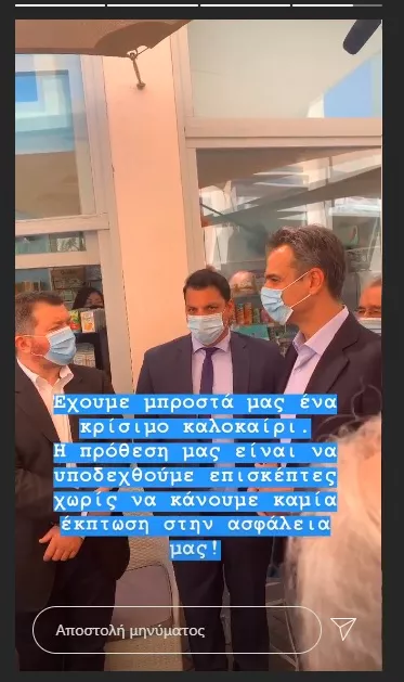 "Έχουμε μπροστά μας ένα κρίσιμο καλοκαίρι. Η πρόθεση μας είναι να υποδεχθούμε επισκέπτες χωρίς να κάνουμε καμία έκπτωση στην ασφάλειά μας!" ήταν το μήνυμα του κ. Μητσοτάκη σε ιστορία που ανάρτησε στο Instagram.