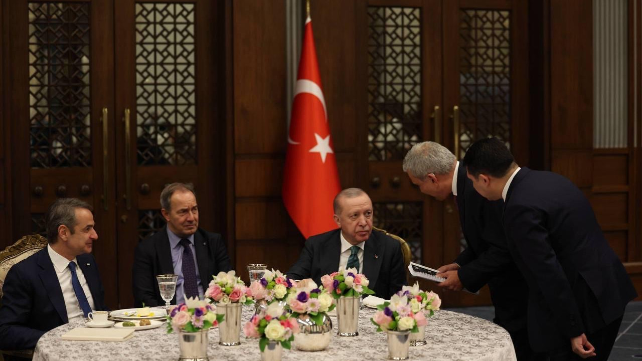 Μια συνάντηση με πολλές σημειολογικές λεπτομέρειες ήταν η χθεσινή στην Άγκυρα, με αποκορύφωμα το δείπνο που παρέθεσε ο Τούρκος πρόεδρος Ρετζέπ Ταγίπ Ερντογάν στον Έλληνα πρωθυπουργό Κυριάκο Μητσοτάκη. Ξεχώρισε, μάλιστα, το video wall όπου προβάλλονταν εικόνες των δύο ηγετών και μήνυμα καλωσορίσματος του κ. Μητσοτάκη στην Άγκυρα στα τουρκικά και στα ελληνικά.