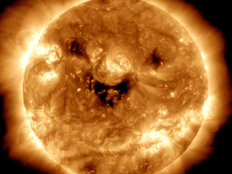 Today, NASA’s Solar Dynamics Observatory caught the Sun "smiling." Seen in ultraviolet light, these dark patches on the Sun are known as coronal holes and are regions where fast solar wind gushes out into space. pic.twitter.com/hVRXaN7Z31