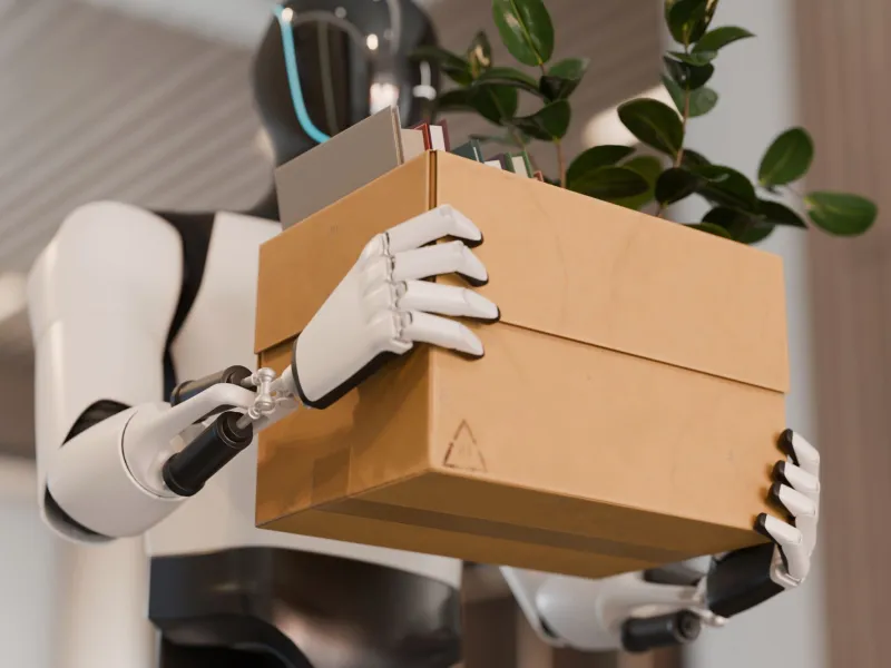 Μέσα στο πολύβουο κατάστημα, ρομπότ διαφόρων μεγεθών και σχημάτων επιδεικνύουν τις δυνατότητές τους: κάποια παίζουν ποδόσφαιρο, άλλα λειτουργούν ως βοηθοί λιανικής, ενώ μια άλλη ομάδα παίζει μουσικά όργανα.