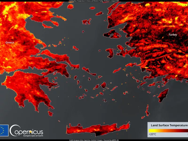 Η έτερη εικόνα του ευρωπαϊκού δορυφoρικού δικτύου Copernicus απεικονίζει χρωματικά τη θερμοκρασία εδάφους στη χώρα μας η οποία έφτανε χθες τους 53 βαθμούς Κελσίου, με το έδαφος να είναι στο "κόκκινο".