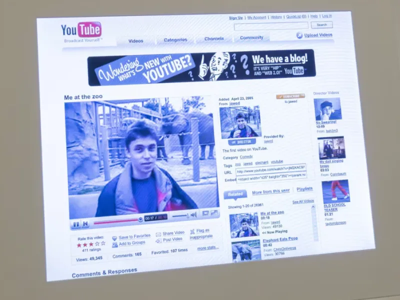 Η ανακατασκευή της αρχικής σελίδας προβολής βίντεο περιλαμβάνει το ιστορικό πλέον «Εγώ στον ζωολογικό κήπο», στο οποίο ο τότε 25χρονος Κarim καταγράφεται στον ζωολογικό κήπο του Σαν- Ντιέγο να μιλά για… ελέφαντες.