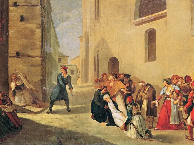 Ο Καποδίστριας, φορώντας το τσόχινο παλτό, το καπέλο και κρατώντας τα γάντια του, καθώς πλησίαζε στην είσοδο του ναού, κοντοστάθηκε και έριξε μια ματιά προς το σπίτι του Ροδίου. Λίγα βήματα από το πλατύσκαλο της εκκλησίας έβγαλε με το αριστερό χέρι το καπέλο του, όχι για να χαιρετίσει τους Μαυρομιχαλαίους, αλλά επειδή ετοιμαζόταν να εισέλθει στην εκκλησία ασκεπής για να κάνει το σταυρό του. Την ίδια ακριβώς στιγμή ο Κωνσταντίνος Μαυρομιχάλης, που βρισκόταν απέναντι από τον Καποδίστρια, τον άρπαξε με το αριστερό χέρι και τον πυροβόλησε με την μπιστόλα που κρατούσε στο δεξί του χέρι, στην περιοχή του ινιακού οστού (στη βάση του κρανίου) και συγκεκριμένα πίσω από το δεξί αυτί, λέγοντάς του: «και γω κακά χερόβολα και συ κακά δεμάτια».