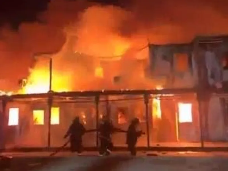 Εικόνες από τοπικά μέσα ενημέρωσης που τραβήχτηκαν κατά τη διάρκεια της νύχτας έδειχναν φλόγες να κατακλύζουν ένα κτίριο, ενώ πυκνός καπνός υψωνόταν από άλλο τμήμα του ίδιου συγκροτήματος και εργαζόμενοι απομάκρυναν σορούς σε φορεία.