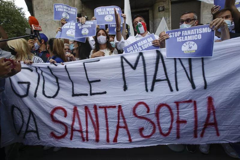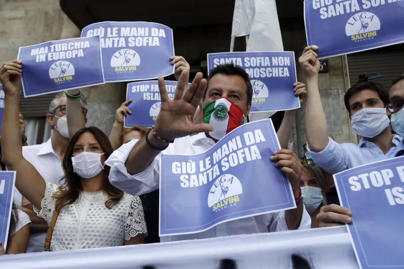 Σε διαμαρτυρία για τη μετατροπή της Αγίας Σοφίας σε τζαμί μπροστά από το τουρκικό προξενείο στο Μιλάνο της Ιταλίας προχώρησε τη Δευτέρα ο Ματέο Σαλβίνι και το κόμμα του Λέγκα. Ο επικεφαλής της Λέγκας και οι οπαδοί του ιταλικού κόμματος κρατούσαν πανό και πλακάτ με κεντρικό σύνθημα «κάτω τα χέρια από την Αγία Σοφία».