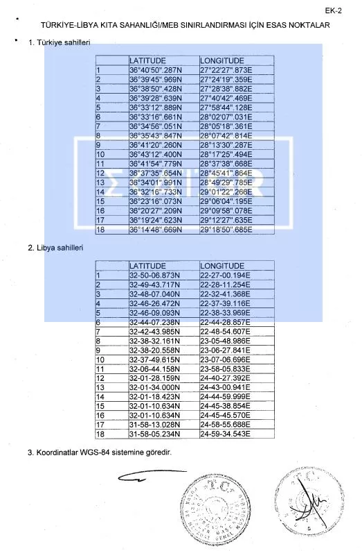 Υπενθυμίζεται ότι το μνημόνιο, παραβιάζοντας την ελληνική ΑΟΖ, περιέχει 18 συντεταγμένες εκ μέρους της Τουρκίας και 18 εκ μέρους της Λιβυής καθώς και αναλυτικούς χάρτες. Πριν από λίγες ημέρες, ο αναπληρωτής διευθυντής Ναυτιλίας και Αεροπορίας του τουρκικού ΥΠΕΞ, Τσαγάταϊ Ερτσίγες, ενημερώνοντας την κοινοβουλευτική επιτροπή εξωτερικών της τουρκικής εθνοσυνέλευσης, ανέφερε ότι με την υπογραφή του μνημονίου έχουν καθορίσει την υφαλοκρηπίδα και την ΑΟΖ μεταξύ των δύο χωρών με μια γραμμή 18,6 θαλάσσιων μιλίων.